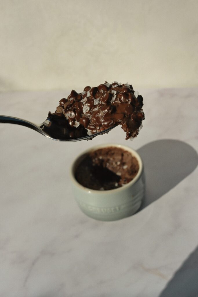 1 scoop protein powder 2 tbsp oat flour 2 tbsp cacao powder 1/4 tsp baking powder 2/3 cup almond milk 1 tbsp Chocolate chips Flakey sea salt